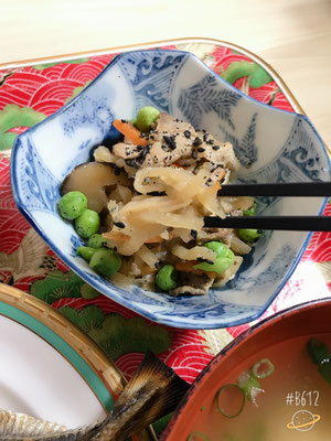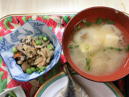 切り干し大根は、軽そうに見えて豚肉もにんじんもしいたけも入っていてしっかりお腹に溜まります〜😚、グリーピースが彩りステキです!.